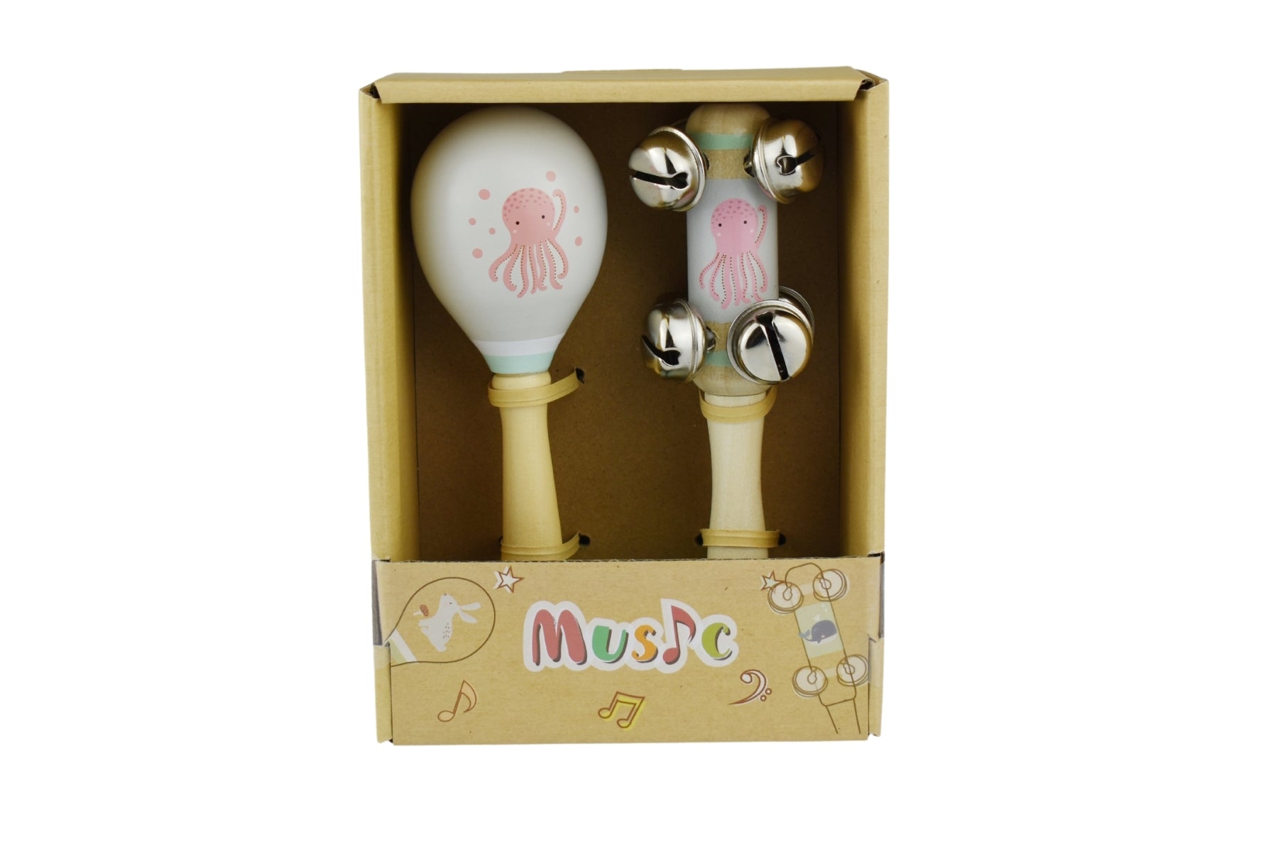 Perfect sensory gift for babies, these music sets includes a maraca and bell stick with a cute sea animal design in pastel colours.