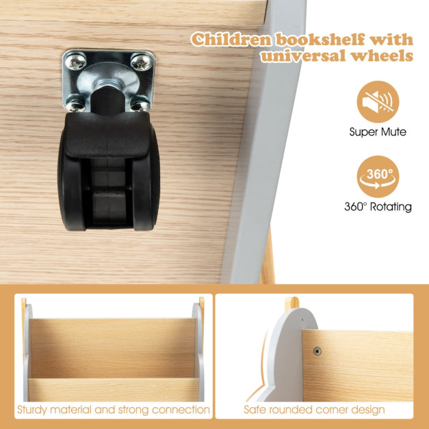 Easy Mobility: Equipped with four smooth universal wheels, this kids bookshelf can be effortlessly moved from room to room. The quiet operation of the wheels won't disturb household members, while the rounded corners ensure safety during transportation.