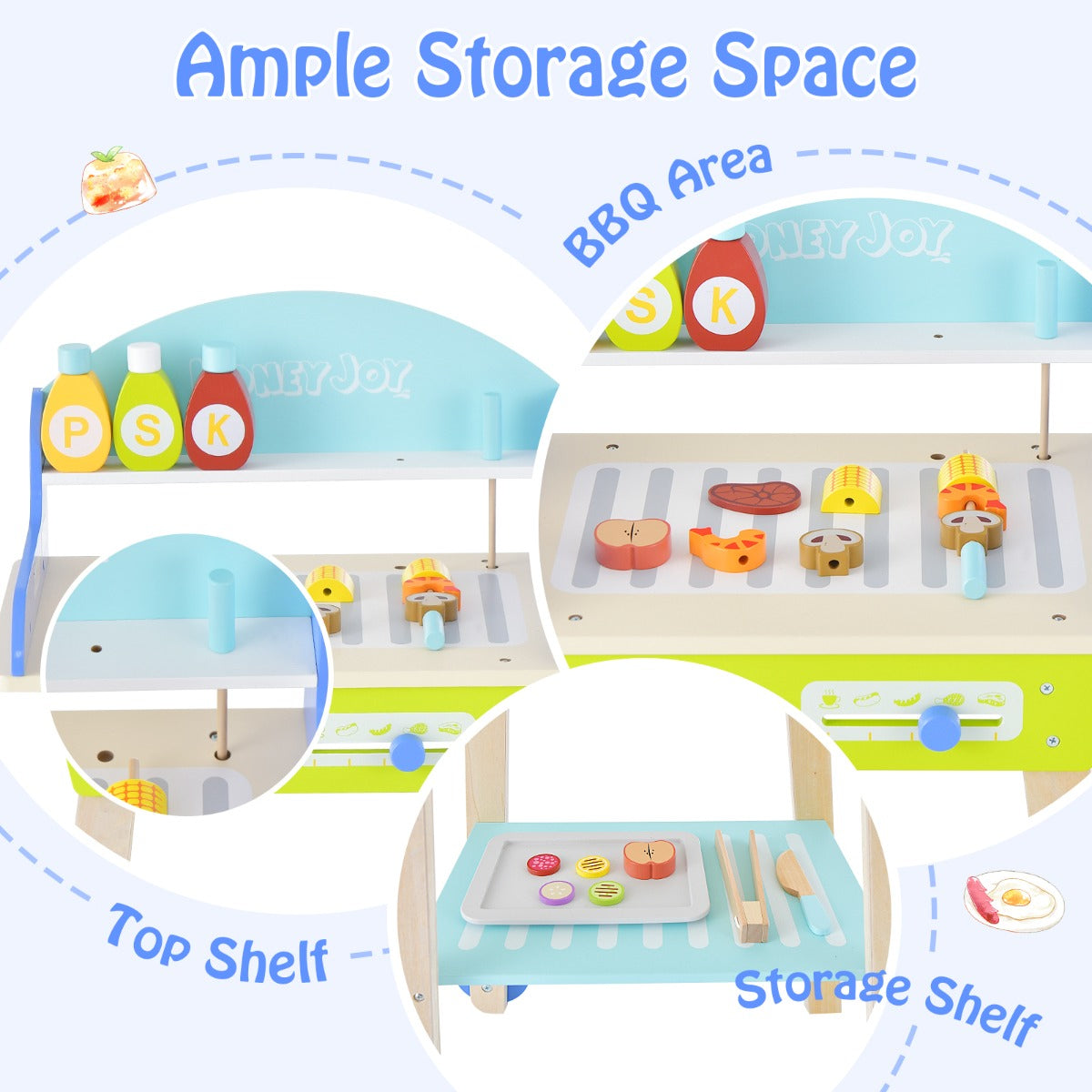 Sufficient Storage Space: Featuring a top shelf with 2 holes for condiments and skewers, a wide BBQ area, and a bottom storage shelf, this set helps kids develop organizational skills.