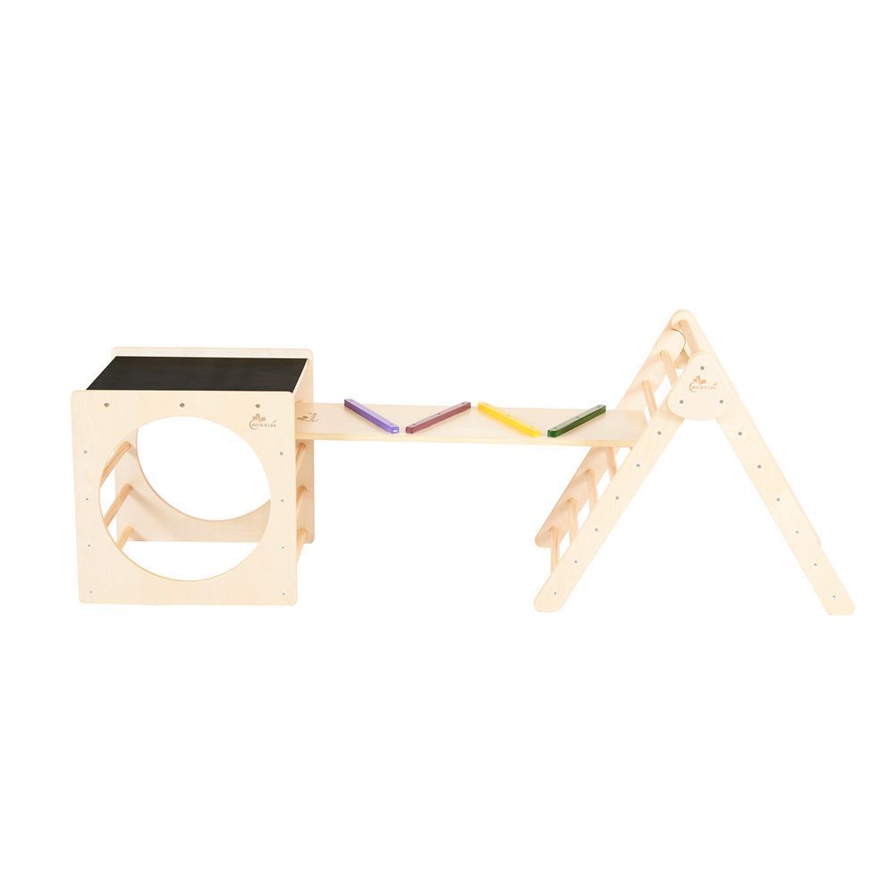 The 2 dowel bar sides of the Activity Cube make it easy to be connected with other Pikler toys to create open ended play, such as hiding, climbing and tunnel crawling.
