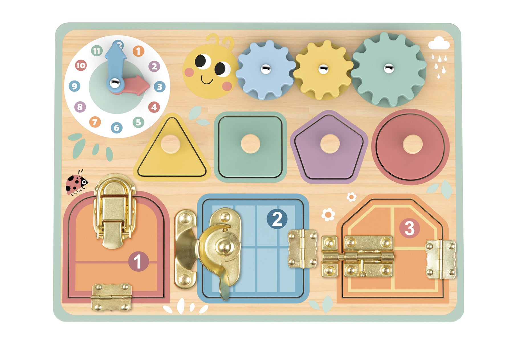 - Enhance cognitive development with activities like shape sorting using the four-piece sorter, providing tactile stimulation through turning cogs, and introducing time and numbers with movable clock hands.